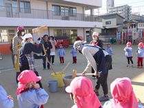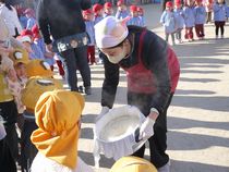 園庭に石臼が用意されているのを見て、「今日はおもちつき♪」と楽しみにしている様子でした(^^)/