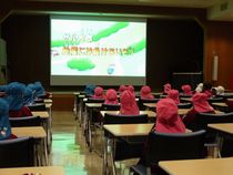もしもの災害のときにはどんな行動をとったらいいのかな?ということを、DVDや職員の方のお話で聞き、煙の中での避難や、地震体験機の中で身を守ることを実際に行いました。